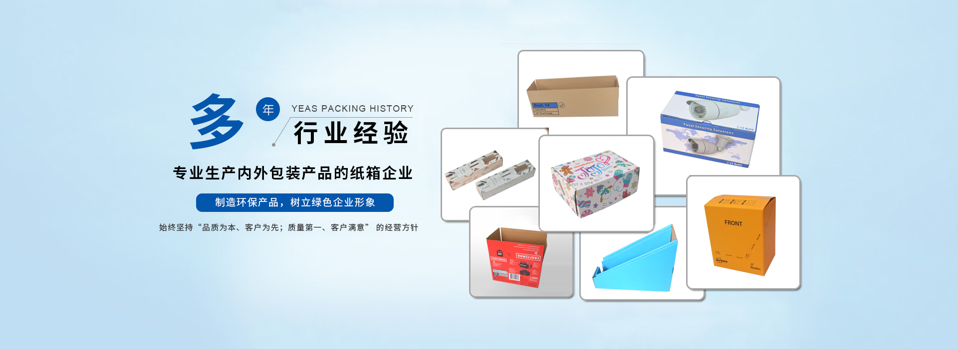 我司主要生產(chǎn)瓦楞紙箱、隔板,禮品盒、彩盒,啤盒;啤卡 ,紙護(hù)角 ,紙卡板,說明書,不干膠,珍珠棉,輔助包材集生產(chǎn)和銷售于一體;公司在材料采購、生產(chǎn)控制、成品檢驗(yàn)、售后服務(wù)包裝需求嚴(yán)格執(zhí)行ISO9001質(zhì)量體系標(biāo)準(zhǔn);我公司目前為SONY,欣旺達(dá)電子,嘉盛照明,庫偉實(shí)業(yè),洲明節(jié)能科技; 泛美照明科技, 怡化金融設(shè)備,美利龍餐具,中天世紀(jì),東芝電器 ,共進(jìn)電子等大中型企業(yè)公司配套供應(yīng)包裝紙箱,建立了穩(wěn)定的合作關(guān)系。